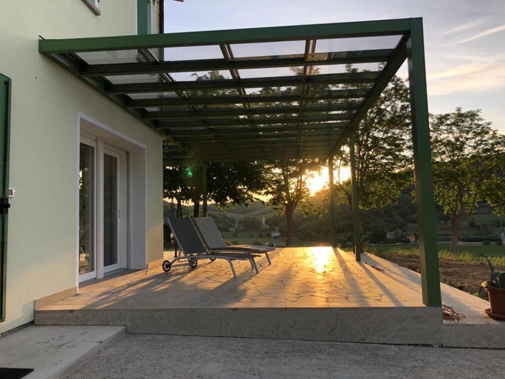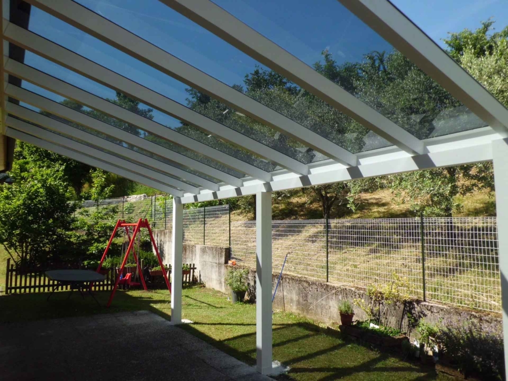con lastre fisse fissate sui profili in alluminio, completa di grondaia e pluviale.